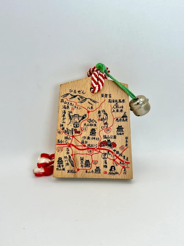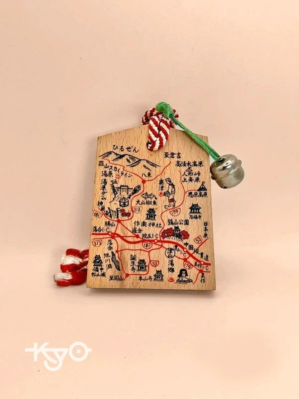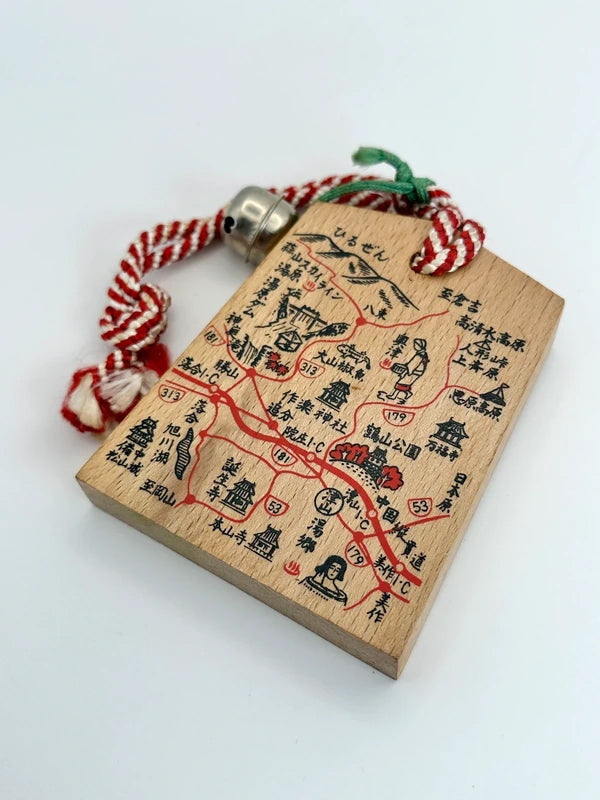 Originating from the Hiruzen Highlands region in Okayama Prefecture, this unique item features an intricately illustrated local map adorned with historical landmarks, temples, and scenic routes. The hand-drawn map in black and red ink captures the cultural essence of the area, showcasing routes like Route 181 and iconic sites such as Mt. Daisen (大山), Hiruzen Highlands (ひるぜん), and local shrines.